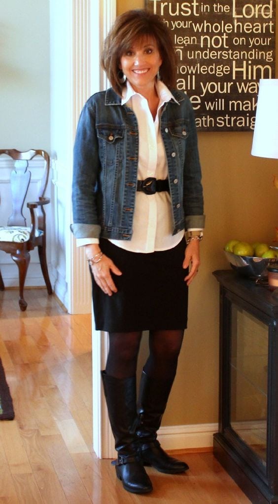 Мини-юбки, хоть и подойдут обладательницам стройных ног, но я всё-таки воздержалась бы от такого выбора. Лучше выбрать юбку чуть выше колена и носить их лучше всего только с непрозрачными колготками. А если вы жить не можете без мини, то вот отличный вариант: туника с узкими джинсами.